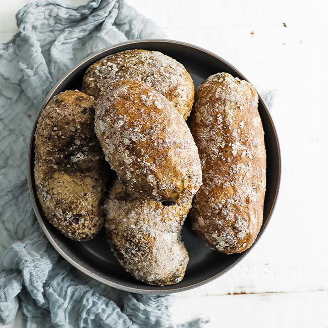 baked potatoes coated in salt in a bowl