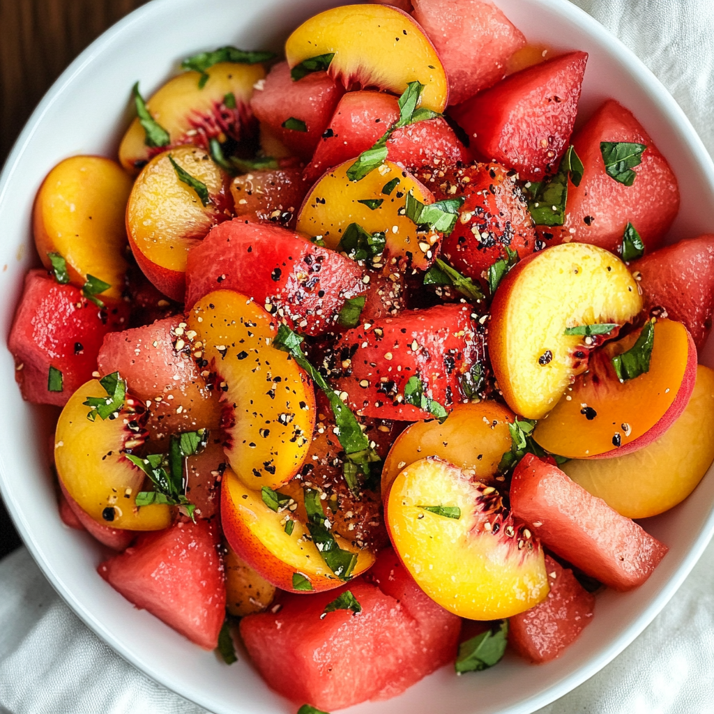 A refreshing and colorful salad that combines the sweetness of peaches with the freshness of watermelon, complemented by herbs, cheese, and a light dressing. Perfect for hot summer days and a versatile dish that pairs well with various main courses or as a standalone snack.