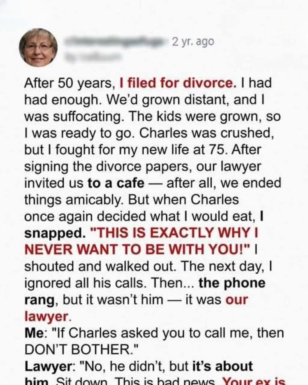 Small disagreements grew into steady tension, and after months of uncertainty, Rose asked Charles for a divorce. Although deeply hurt, he accepted her request, believing that respecting her choice was an expression of care rather than defeat. Shortly after the separation, their family lawyer invited them to dinner, hoping to maintain peace. Charles still wanted to show kindness, and he remembered the small preferences that mattered to Rose.