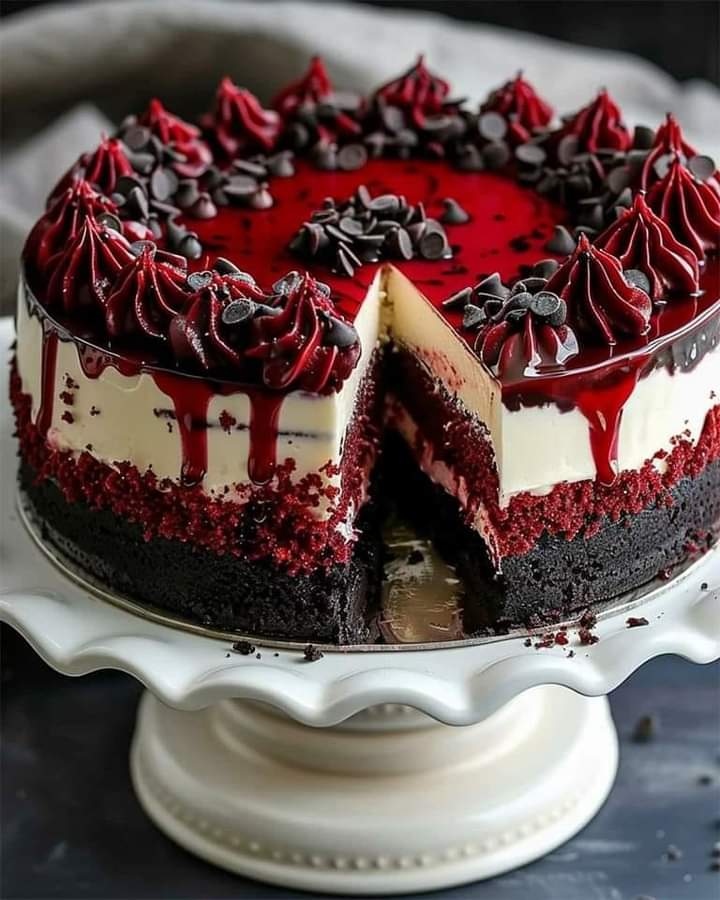 Enjoy this indulgent Red Velvet Cookie Dough Cheesecake! 🍰